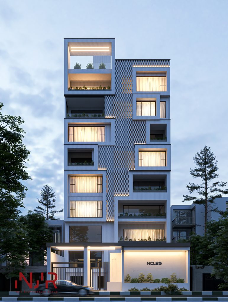 یک آپارتمان هشت طبقه که سرتاسر نمای آن را تعاملی طبیعی-مهندسی پوشانده، نمایی متشکل از سی و شش بالکن و پنجره مربعی شکل که به گفته طراحان به فعالیت‌های متنوع ممکن در یک ساختمان مسکونی اشاره دارد، فعالیت‌هایی در سطوح خصوصی و نیمه‌خصوصی. رنگ‌های روشن نمای سنگی، کرکره‌های چوبی موج‌دار و گیاهانی که طراوت طراحی نما را تشدید می‌کنند، فضایی شاد را در چهارچوبی مهندسی نشان می‌دهد. این آپارتمان که به‌نوعی، نمونه کاملی از عمل‌کردگرایی نمای مسکونی مدرن را معرفی می‌کند با شعار «فرم حتما از عمل‌کرد پیروی می‌کند»، در منطقه ۴ شهر تهران، به سرانجام رسیده است.