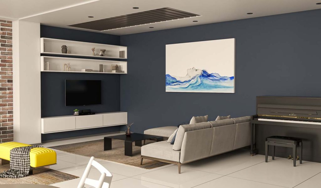 ایشان از ما خواستند که طراحی واحدشان به سبک مدرن باشد و همزمان فضایی گرم صمیمی هم داشته باشیم. سرانجام پس از اتودهایی که زدیم تصمیم بر آن شد که طرحی مینیمال رو اجرا کنیم. و برای حس گرما و صمیمیتر شدن فضا، در قسمت نشیمن مهمان، دیواری آجری و در تیویروم هم دیواری رنگ شده در نظر گرفتیم.