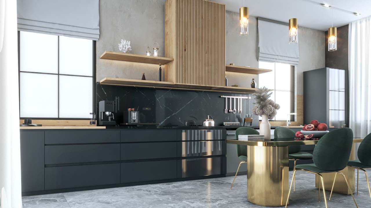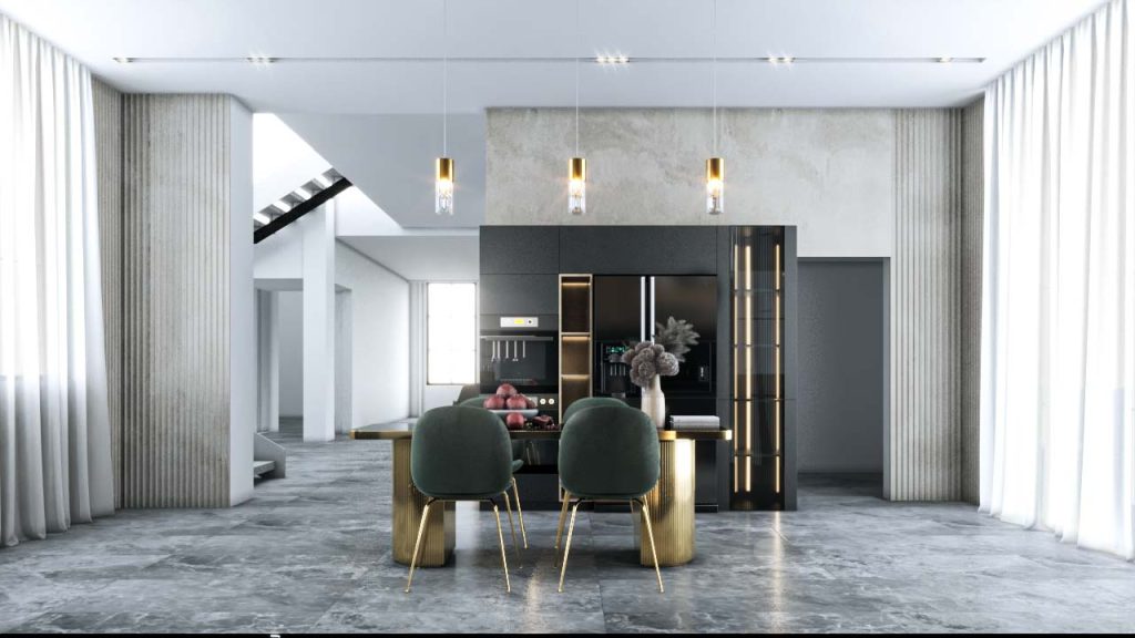 طراحی داخلی آشپزخانه این ویلا بسیار پراهمیت بود.فرم آشپزخانه بهشکلی بود که طراحی کاربردی را دچاار چالش میکردد و در نهایت ما طرحی ارائه دادیم که هم کاربردی بود، هم زیبا و هم مطلبق با خواسته و سلیقه کارفرما.